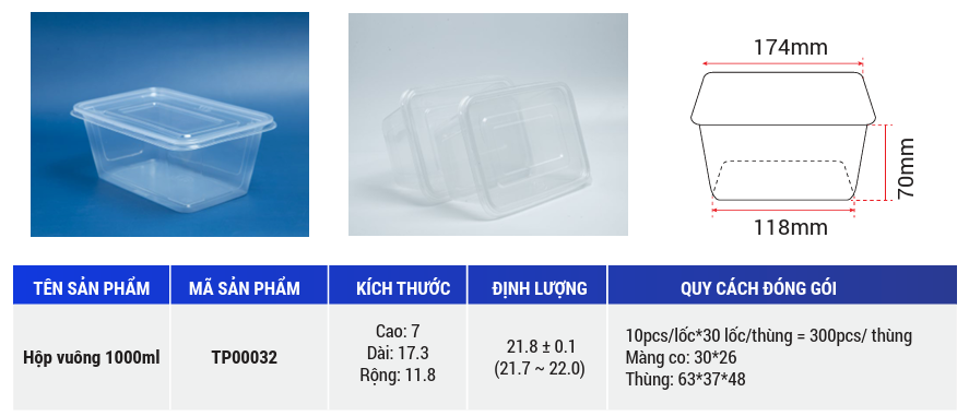 Tien Duc square plastic box are made of plastic material that is safe for users' health. Using plastic food packaging helps preserve food from disease-causing bacteria. With waterproof and transparent features, you can see the food inside. Plastic material is recyclable and environmentally friendly.