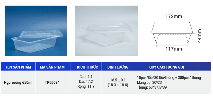 Tien Duc square plastic box are made of plastic material that is safe for users' health. Using plastic food packaging helps preserve food from disease-causing bacteria. With waterproof and transparent features, you can see the food inside. Plastic material is recyclable and environmentally friendly.