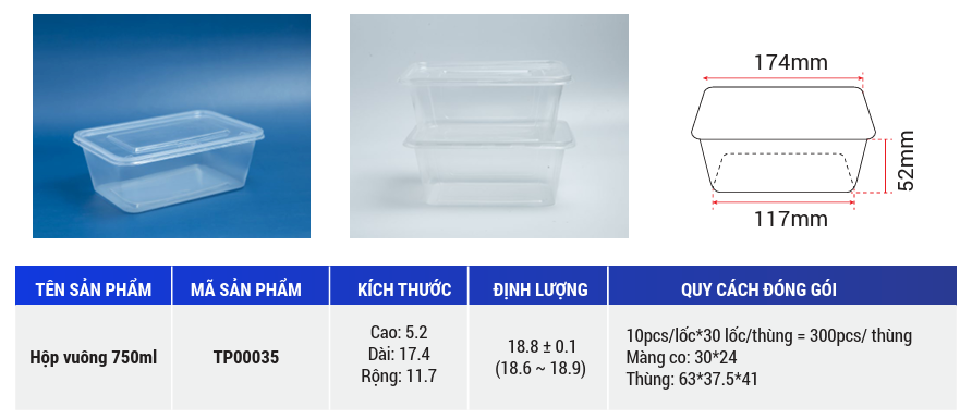 Tien Duc square plastic box are made of plastic material that is safe for users' health. Using plastic food packaging helps preserve food from disease-causing bacteria. With waterproof and transparent features, you can see the food inside. Plastic material is recyclable and environmentally friendly.